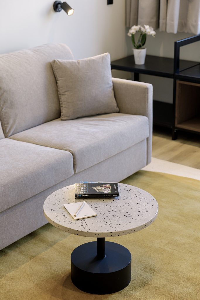 The One Bedroom Apartment with Balcony at master Plaka Athens offers a spacious and serene stay for up to four guests. Spanning 42 sqm, this apartment combines modern minimalist design with neutral tones and functional elements, creating a comfortable retreat.