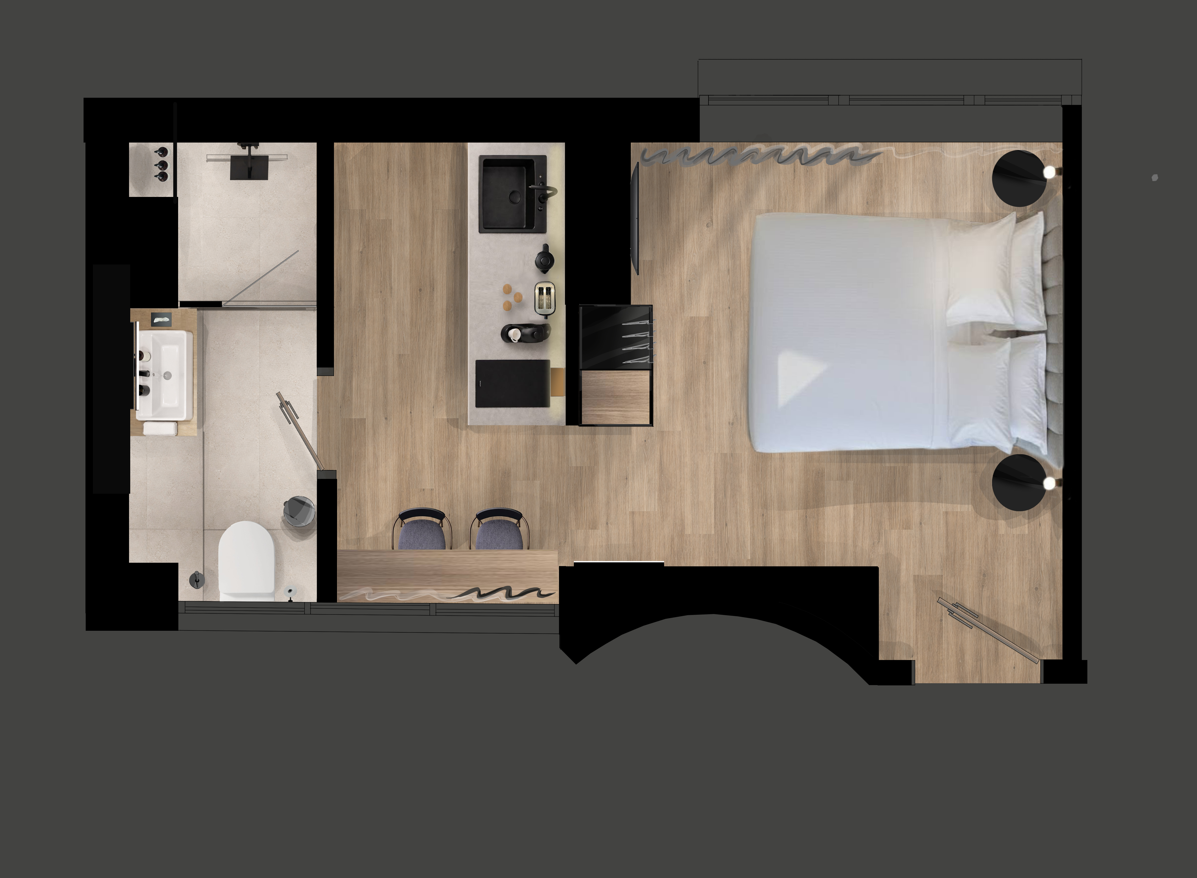 The Plaka Comfort Studio at master Plaka Athens offers a cozy yet stylish retreat, ideal for up to two guests. Spanning 23 sqm, this thoughtfully designed space combines modern minimalist aesthetics with functional elements, creating a serene and comfortable environment.