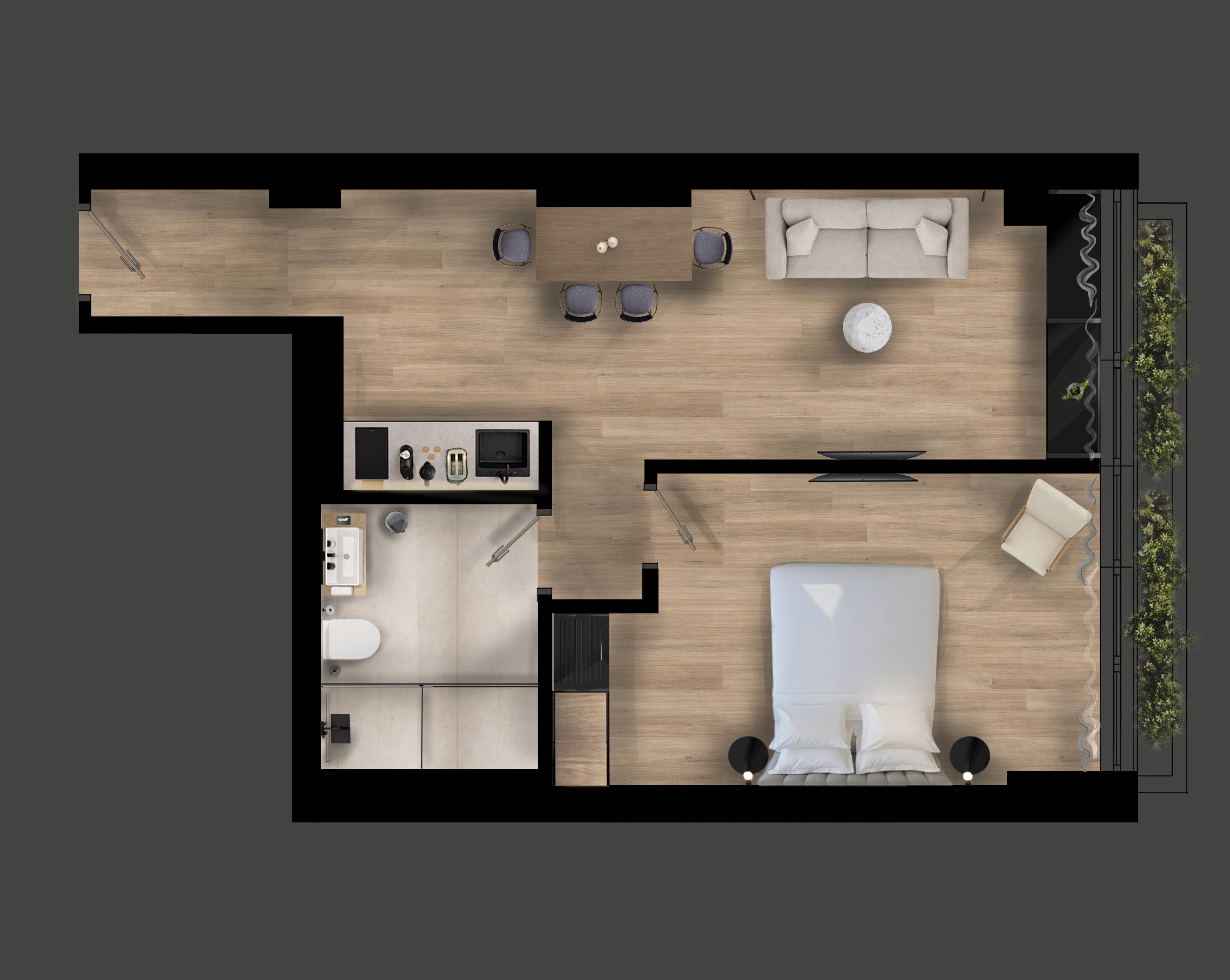 The Plaka One-Bedroom Suite at master Plaka Athens offers a spacious and comfortable stay, accommodating up to four guests. With 42 sqm of modern living space, this suite combines minimalist design, neutral tones, and functional elements to create a relaxing environment.