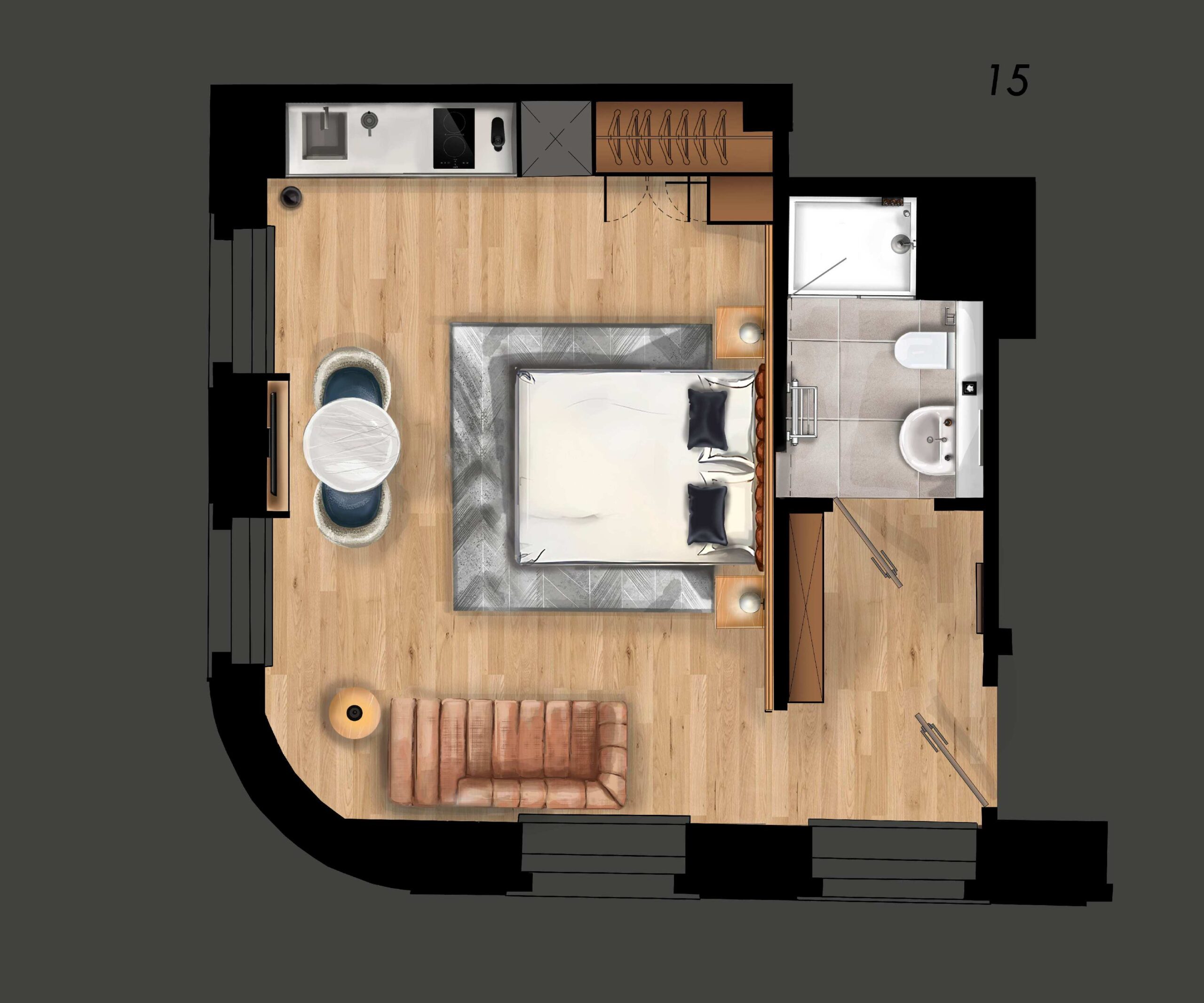 The design draws inspiration from Scandinavian and modern minimalist aesthetics. Warm neutrals, earthy tones, and wooden flooring create a natural, calming ambiance, while clean lines and uncluttered spaces enhance the sense of openness. Cozy upholstered furniture and soft bedding add inviting touches, ensuring a relaxing stay.