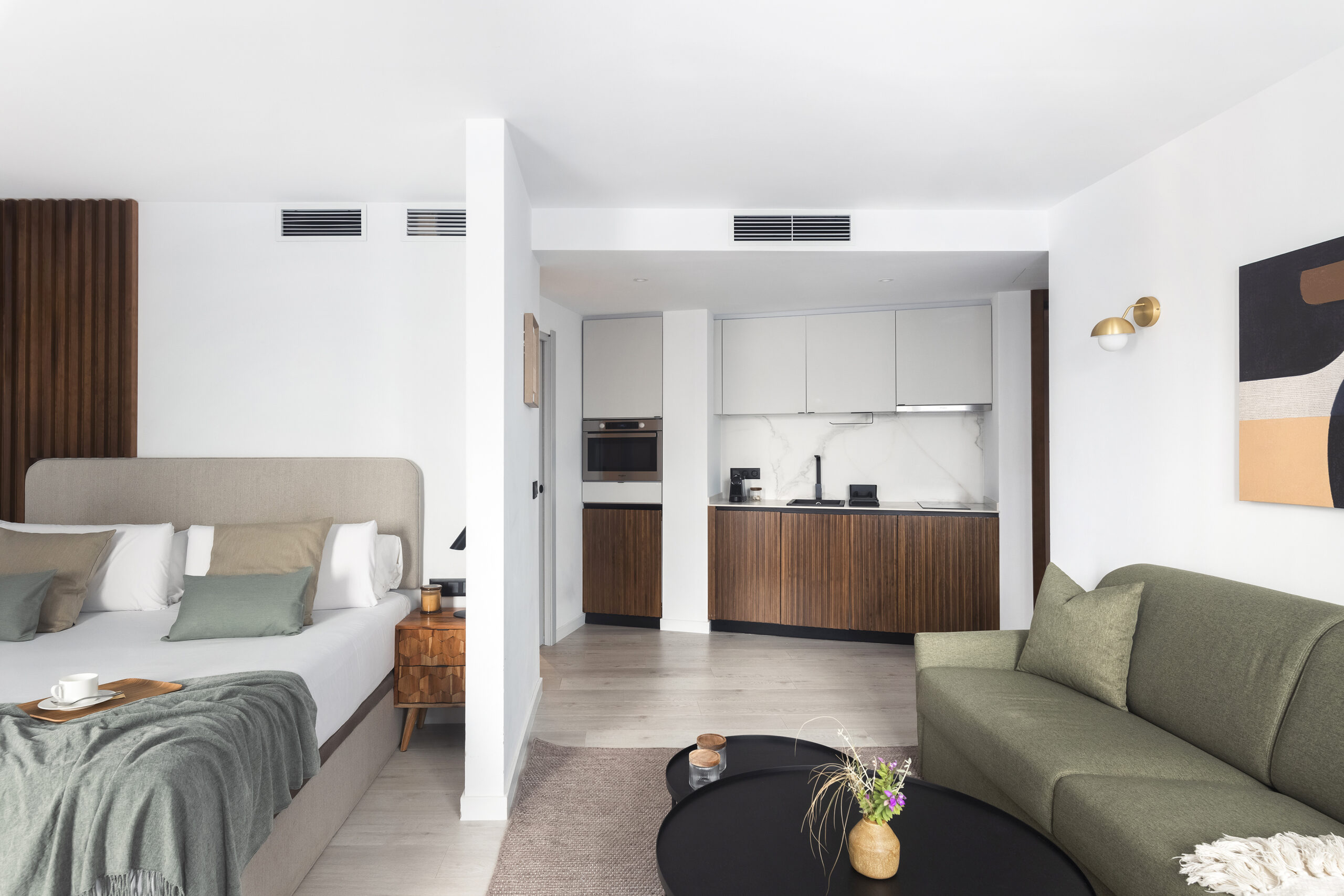 A bright, open space designed for four, this 40 m² studio blends modern Mediterranean charm with clean Scandinavian lines. The layout is smart and functional, with a soft, welcoming warmth and just the right touch of city elegance.