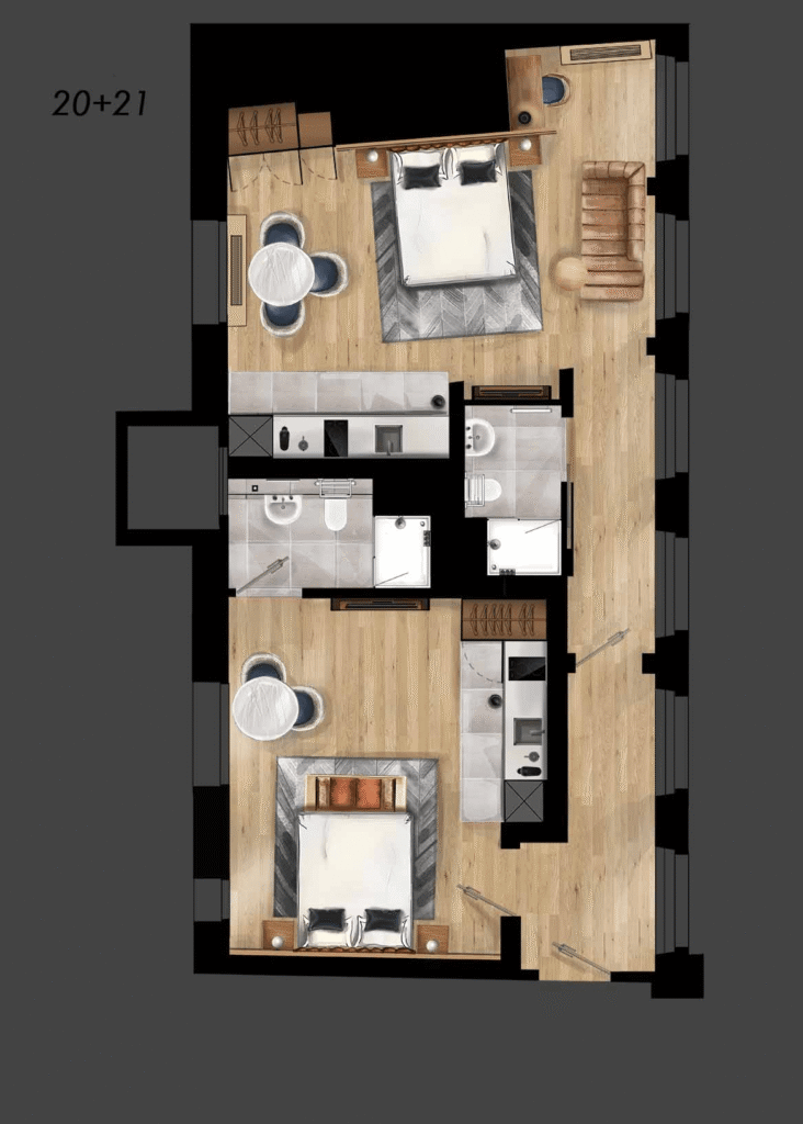 Spanning 56 sqm, the Family Apartment accommodates up to five guests with ease. This apartment combines thoughtful design with a cozy ambiance, making it perfect for larger families or groups. Scandinavian design elements, including warm neutrals, wooden flooring, and functional furniture, create a welcoming space that balances style and practicality.