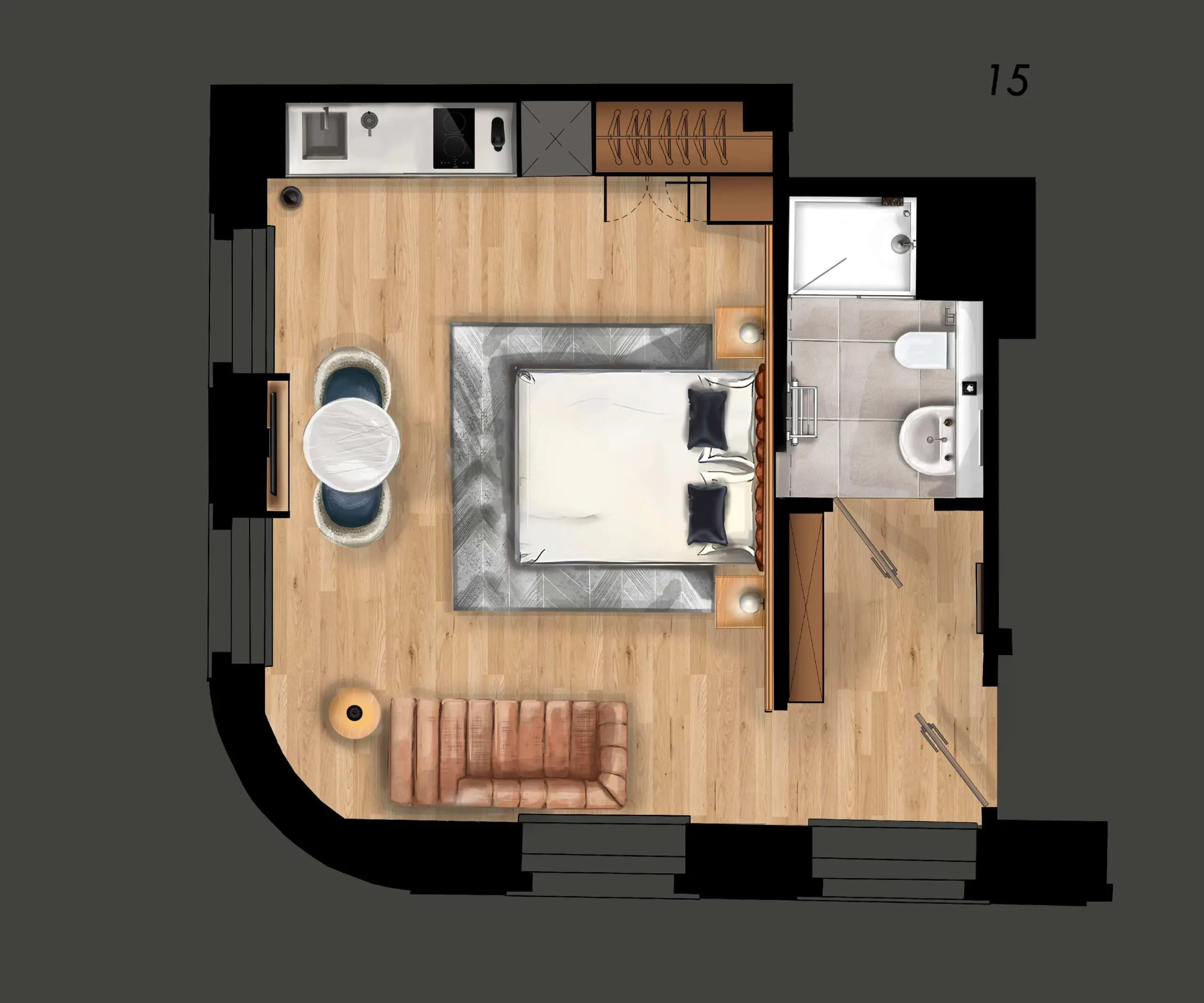 The Studio with Sofa Bed at master Cannon serviced apartments offers a perfectly designed 30 sqm space for up to three guests. Ideal for couples or small groups, this studio combines modern functionality with Scandinavian-inspired aesthetics. The warm palette of neutrals, browns, and earthy hues creates a calming environment, complemented by wooden flooring and simple furniture in natural finishes.