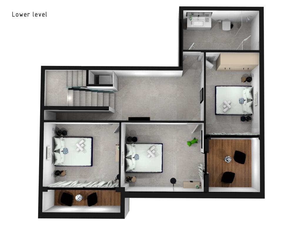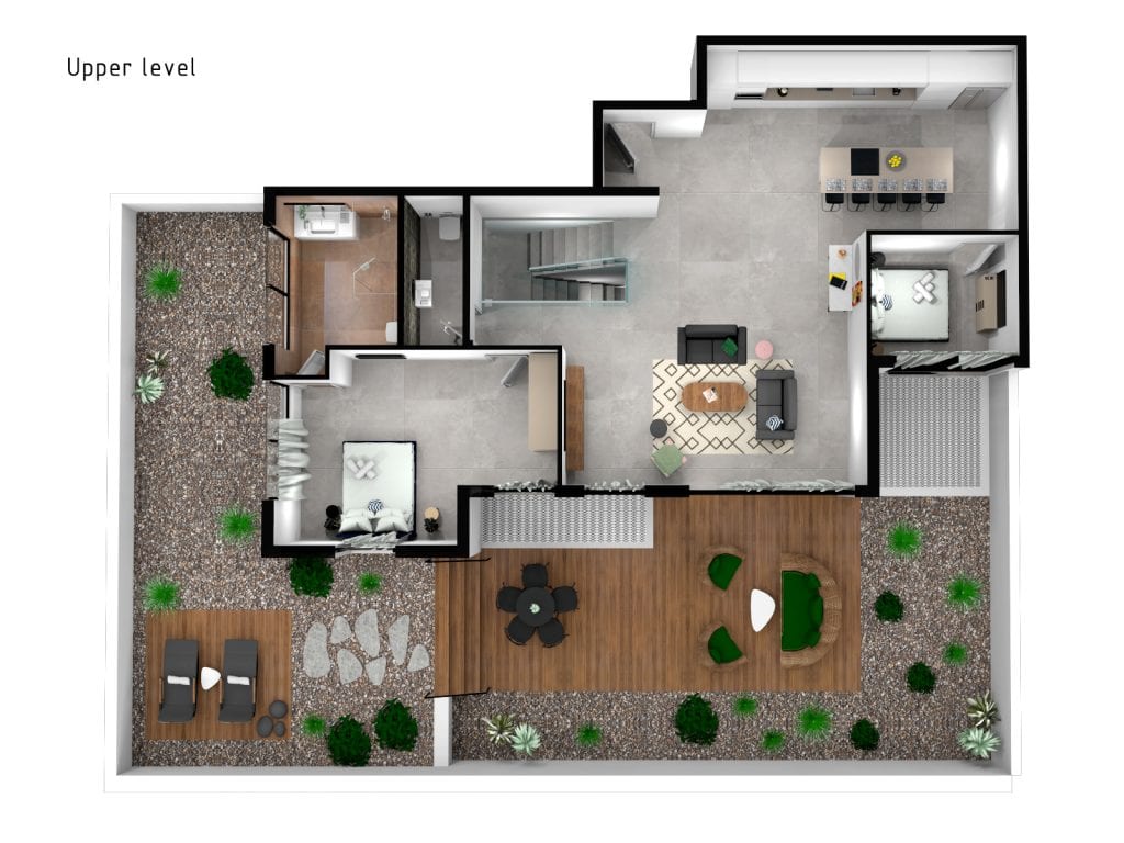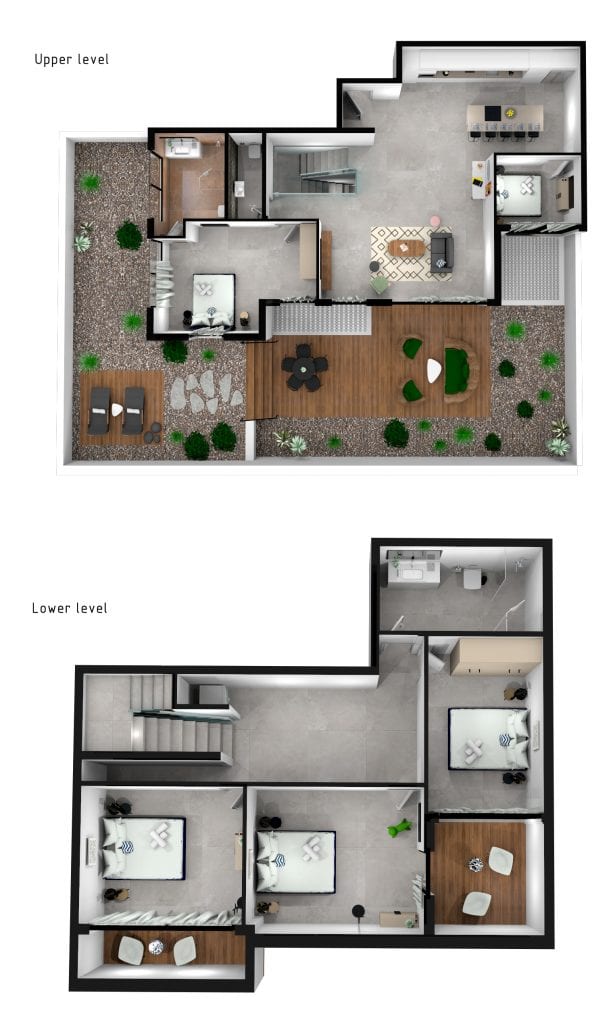 Our Five-Bedroom Duplex Garden serviced apartment is a perfect space for long family vacations and extended business stays. Its serene and stylish 350 sq. m. accommodates up to 10 guests. The private yard is a verdant oasis adorned with lush greenery and exotic plants, has comfy lounge chairs in which you can enjoy al fresco dining or simply chill.