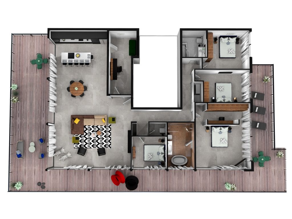 Our spacious 350 sq. m Four-Bedroom Penthouse easily accommodates up to 10 guests. It has a large terrace adorned with sunbeds and tables, a great place to savor your meals alfresco or just chill out with family after a day of sightseeing.