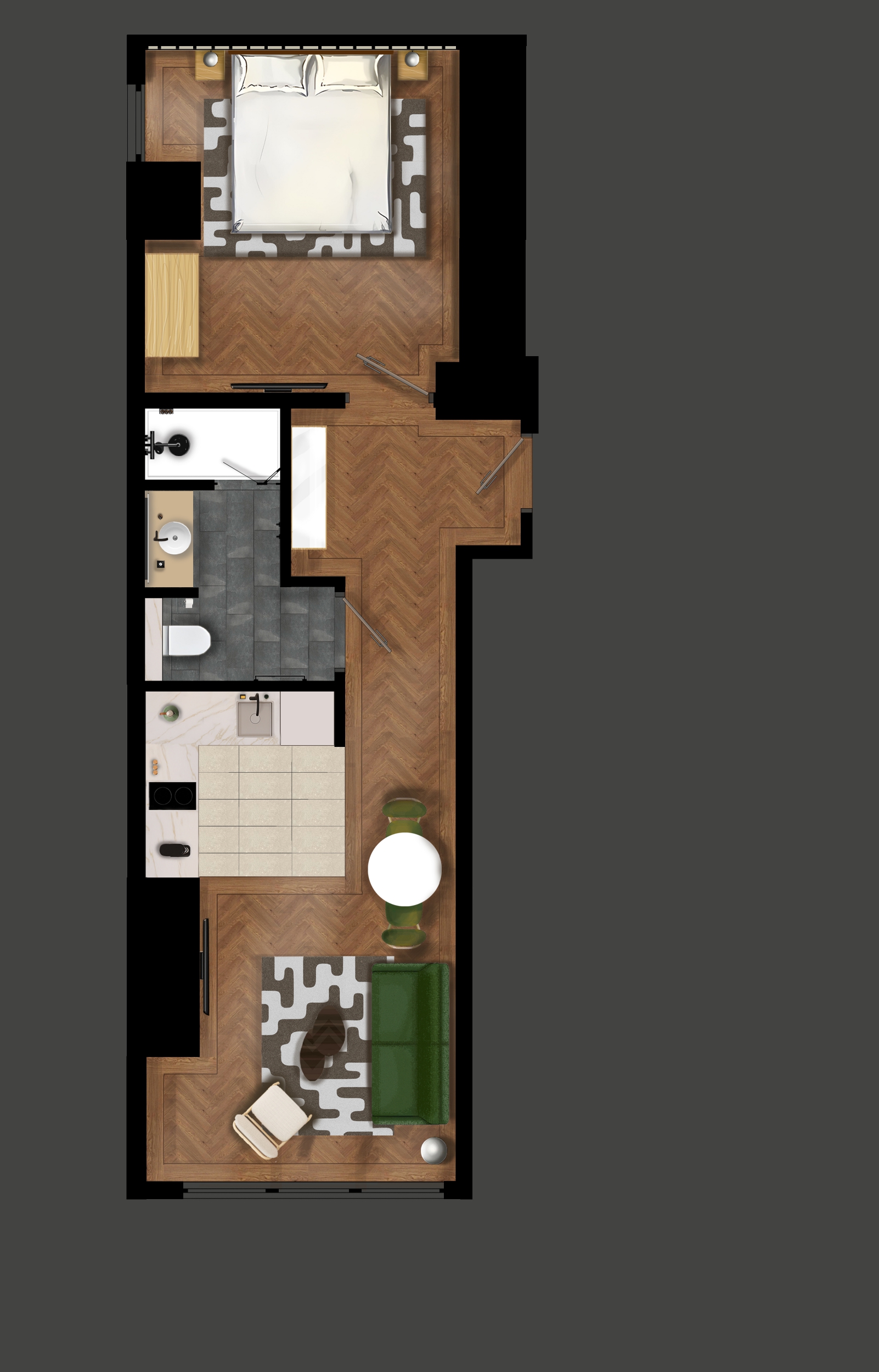 The layout includes a separate bedroom with a king sized bed, a comfortable sofa bed and a dining table perfect for meals or remote work. The interior reflects a blend of modern minimalism, Scandinavian coziness, and functional elegance, creating a warm and welcoming atmosphere.