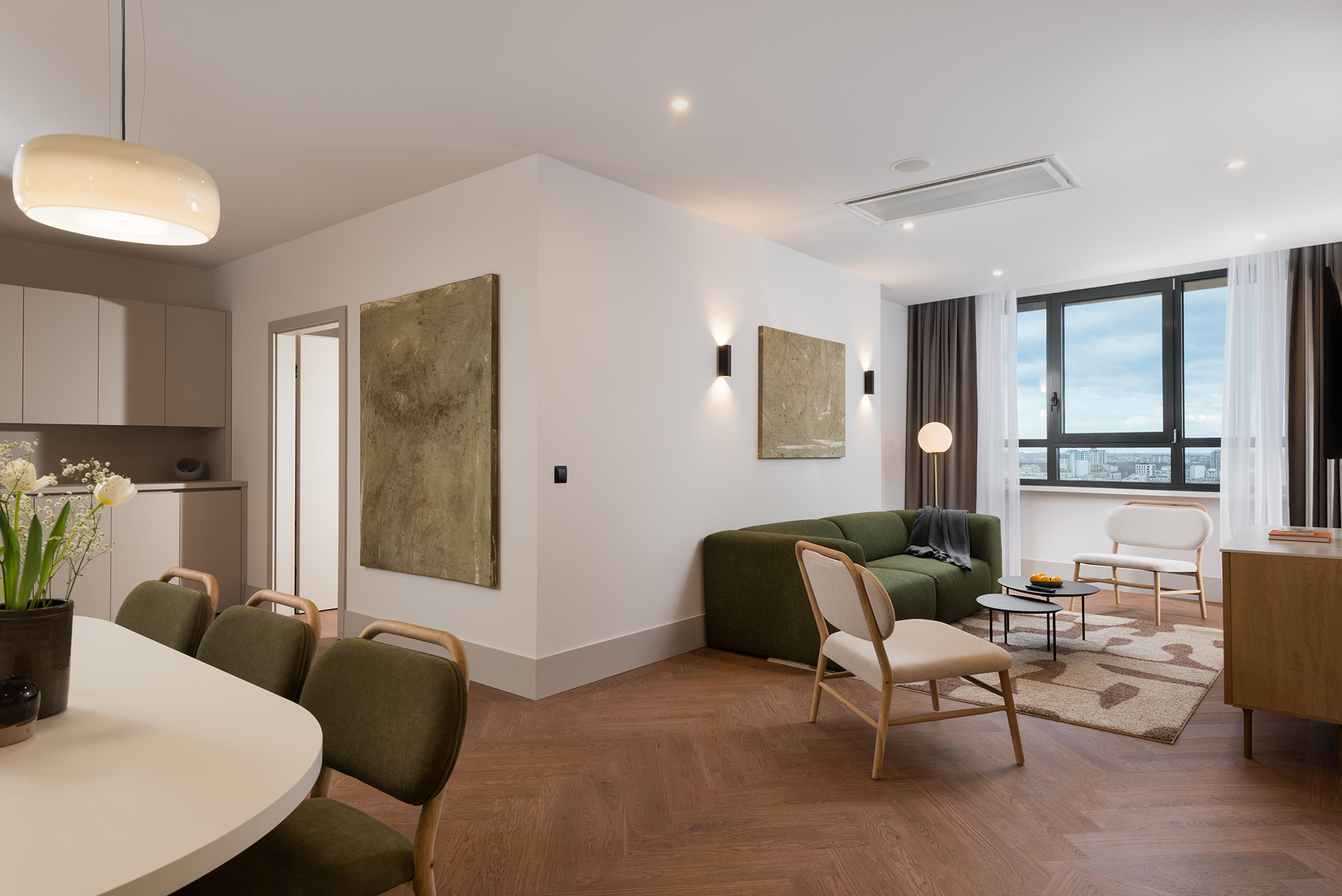 Discover 113 modern serviced apartments crafted for effortless city living at master Wola. Choose from smart studios up to spacious three-bedroom homes, all featuring a calm, minimalist style with warm, natural finishes. Designed to give you space to live life your way, work, unwind, cook, and recharge. Every apartment feels instantly welcoming the moment you arrive.