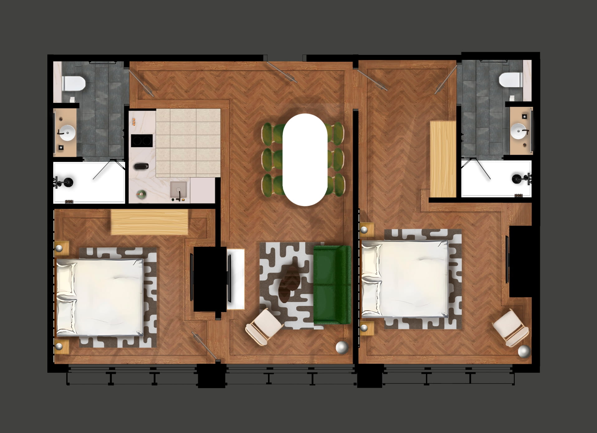 Spacious and thoughtfully designed, this 70 sqm two bedroom apartment at master Wola Serviced Apartments is perfect for families, groups of friends, or travelers who simply want more room to relax. With space for up to six guests, it offers the comfort of a home with the style and service of a modern apartment stay.