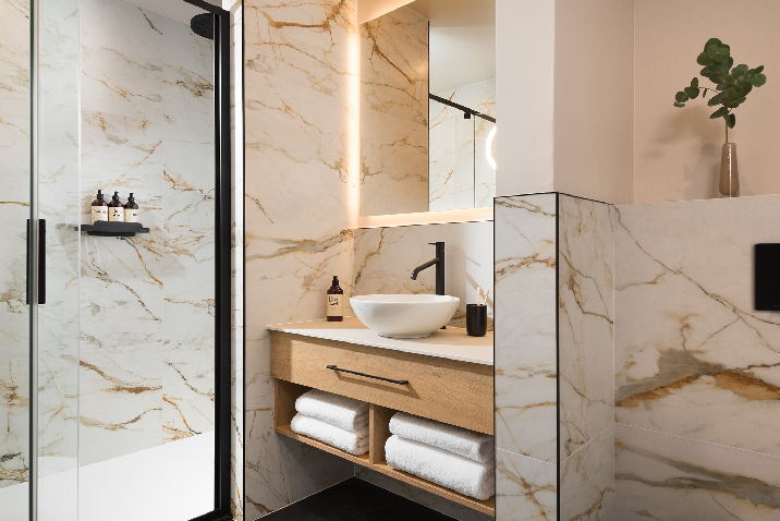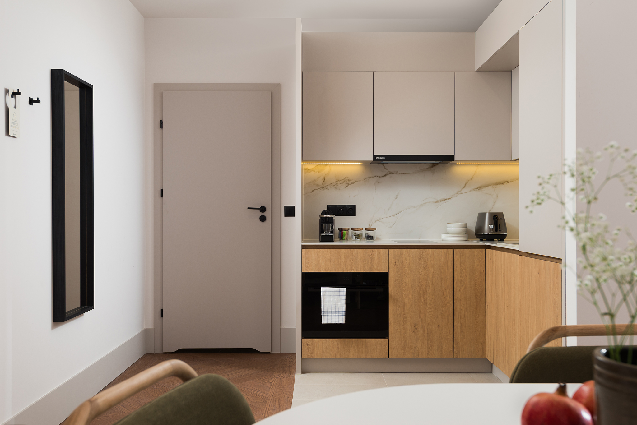 The design blends modern minimalism, Scandinavian warmth, and functional elegance, creating an atmosphere that is calm, contemporary, and welcoming. You will find two bedrooms with king sized beds, a comfortable living room with a sofa bed, and a dining area to enjoy meals together.
